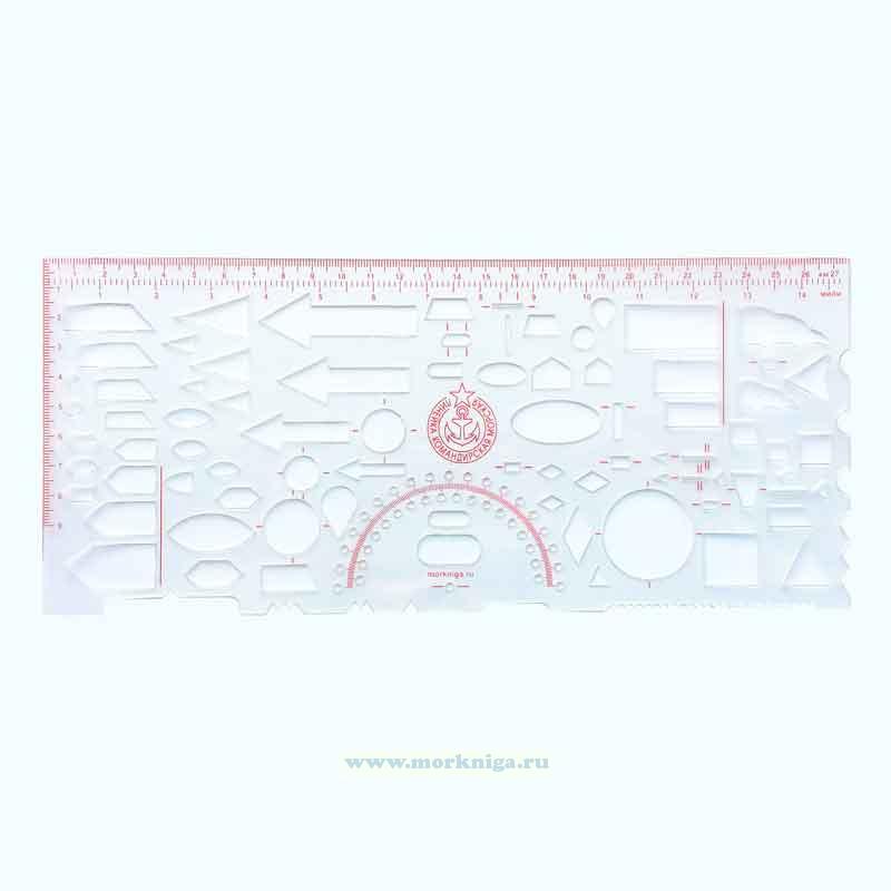 В офицерскую морскую линейку включены транспортир и около 80 сложных фигур, что делает ее универсальной в использовании. Имеет двухстороннюю шкалу. Длина шкалы - 28...