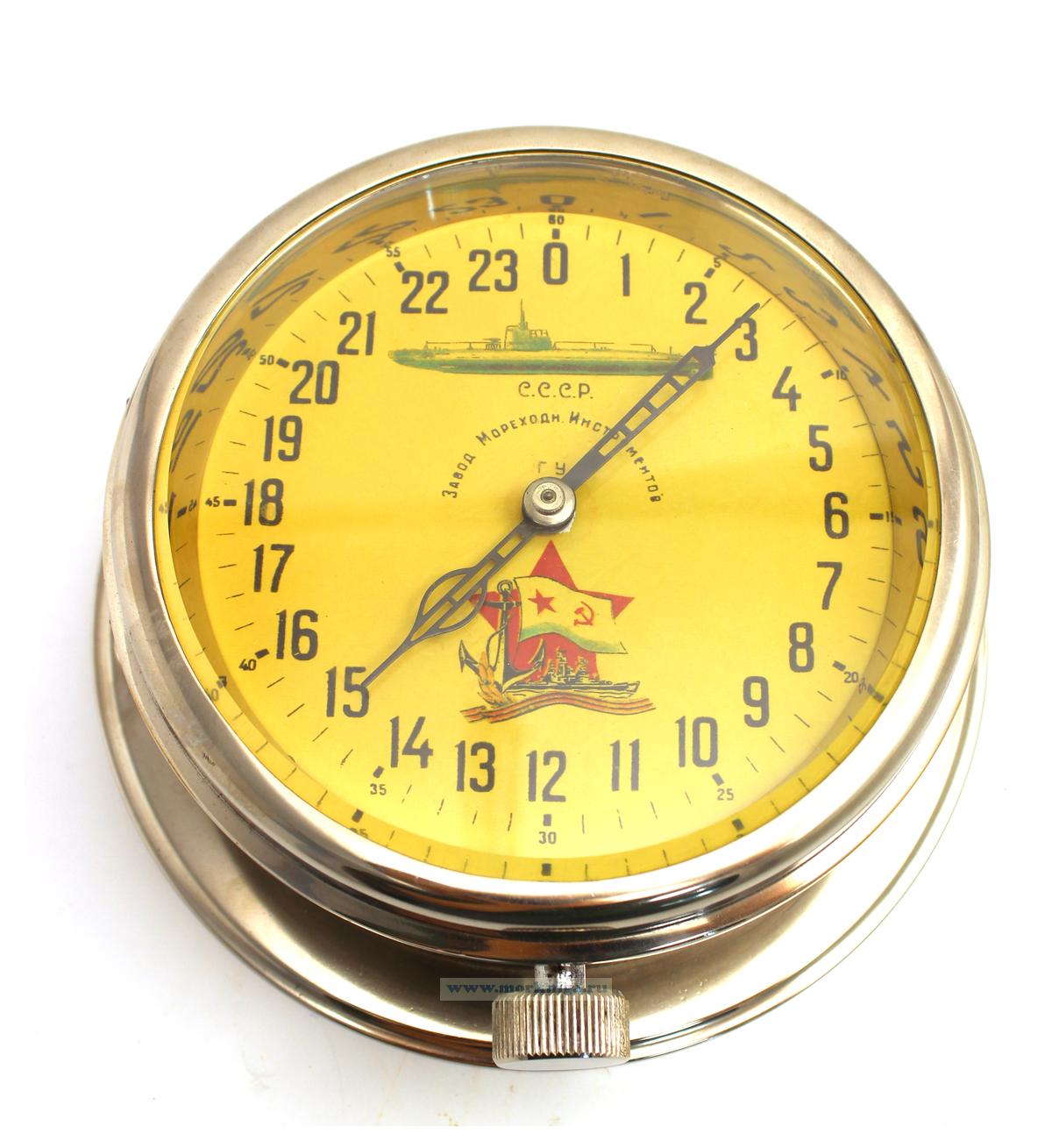 Часы 24-х часовые использовались на подводных лодках до середины 1960-х годов. Изготовлены в СССР на заводе Мореходных инструментов. Часы ходят и показывают точное...