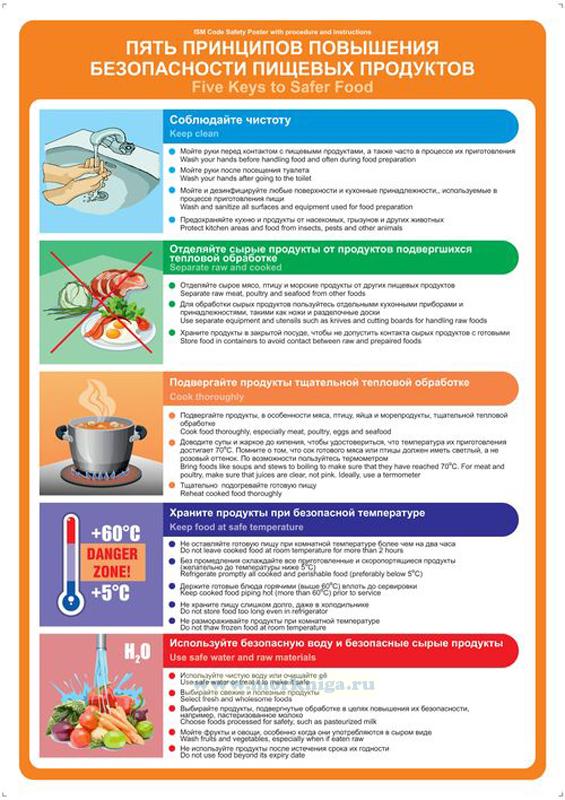 Плакат на русском и английском языках Плакат содержит пять принципов повышения безопасности пищевых продуктов: - Соблюдайте чистоту; - Отделяйте сырые продукты...