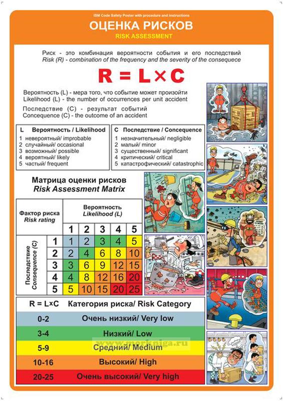 Плакат на русском и английском языке Плакат напоминает и информирует о том, как рассчитать и оценить риски. Материал: самоклеящаяся бумага Формат: А3 (297x420 мм)