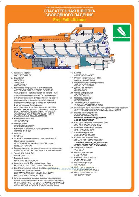Плакат на русском и английском языках Плакат содержит иллюстрацию спасательной шлюпки свободного падения и перечень составляющих ее деталей. Плакат напечатан...