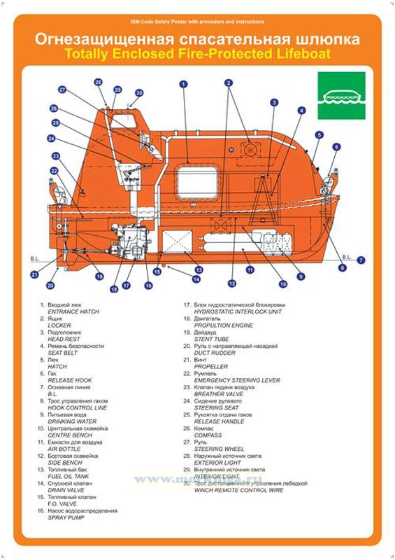 Плакат на русском и английском языках Плакат содержит иллюстрацию огнезащищенной спасательной шлюпки и перечень составляющих ее деталей. Плакат напечатан на...
