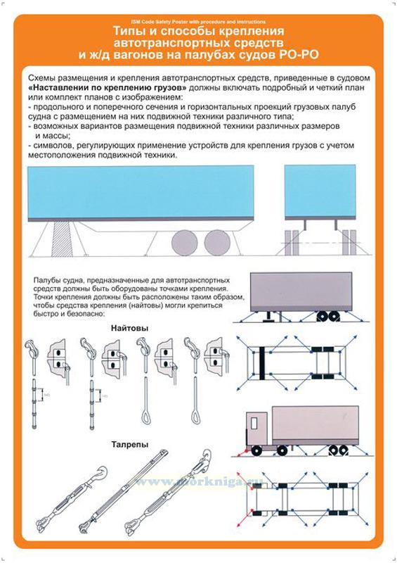 Плакат содержит информацию о типах и способах крепления автотранспортных средств и ж/д вагонов на палубах судов РО-РО Плакат напечатан на самоклеящемся виниле (80...