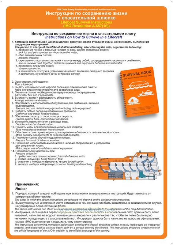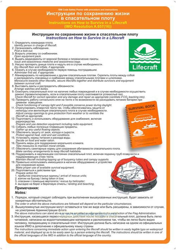 Плакат на русском и английском языках выполнен согласно [url00-00002506]Резолюции А.657(16) Инструкции по действиям в спасательных шлюпках и плотах[/url00-00002506]. Плакат...