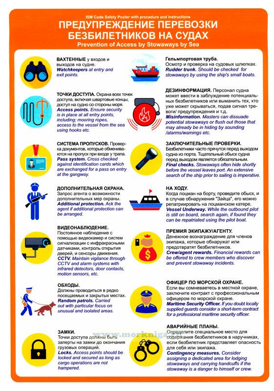 Текст плаката на русском и английском языках. Судовой плакат Предупреждение перевозки безбилетников на судах! prevention of stowaways access by sea. В соответствии с...